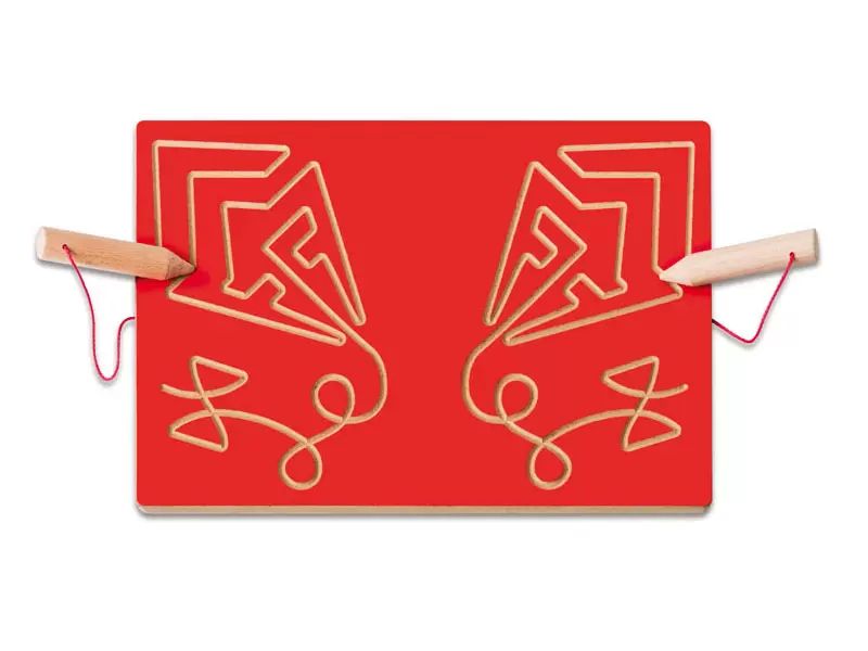 Z vodenjem lesenega svinčnika po vzorcu otrok razvija koordinacijo in pripravlja roko na učenje pisanja črk. Primerno za otroke z izrazito desničarsko ali levičarsko orientacijo (npr. približno 5 let). Izdelano iz MDF-ja. 30 x 21 cm.