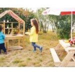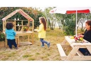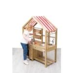 Kuhinjski igralni komplet z delovno ploščo in pomivalnim koritom. Igrača pečica ima na vratih tablo za pisanje s kredo. Dva valjarja med uporabo oddajata zvoke. Streha ščiti pred soncem. Dimenzije kompleta: 100 x 48 x 136 cm; material: impregniran in lakiran finski bor.