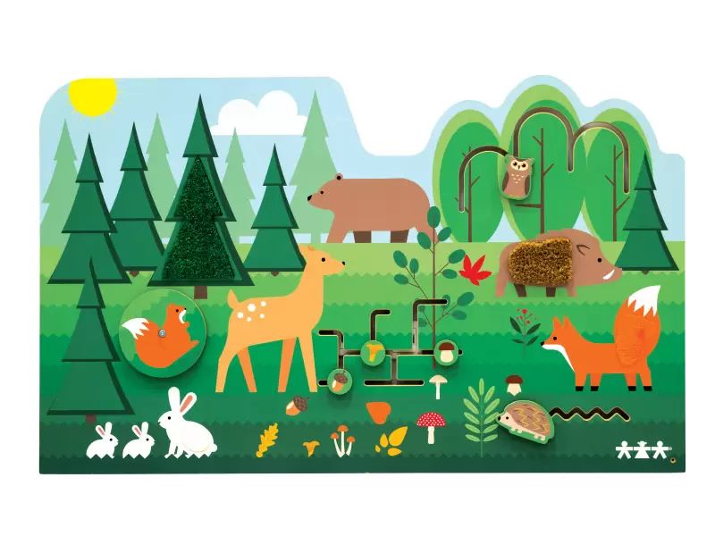 Manipulacijska plošča z gozdno tematiko. Opremljena je s 3 premičnimi elementi, 4 elementi s teksturo in 1 vrtljivim elementom. Plošča je izdelana iz MDF plošče s potiskom. Dimenzije: 130 x 79 cm.
