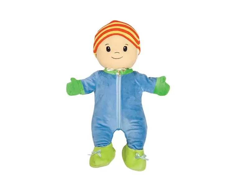 Mehka punčka s kompletom oblačil (8 kosov) z različnimi zaponkami (ježki, zadrga, čipka). V 44 cm / več plasti oblačil