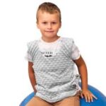 velikost S; višina 110 – 125 cm; obseg prsnega koša 50 cm, teža 2,1 kg; material: siva tkanina Minky, bombažna tkanina z vzorcem ježka; nastavljivi naramnici s 4 belimi plastičnimi zaponkami;