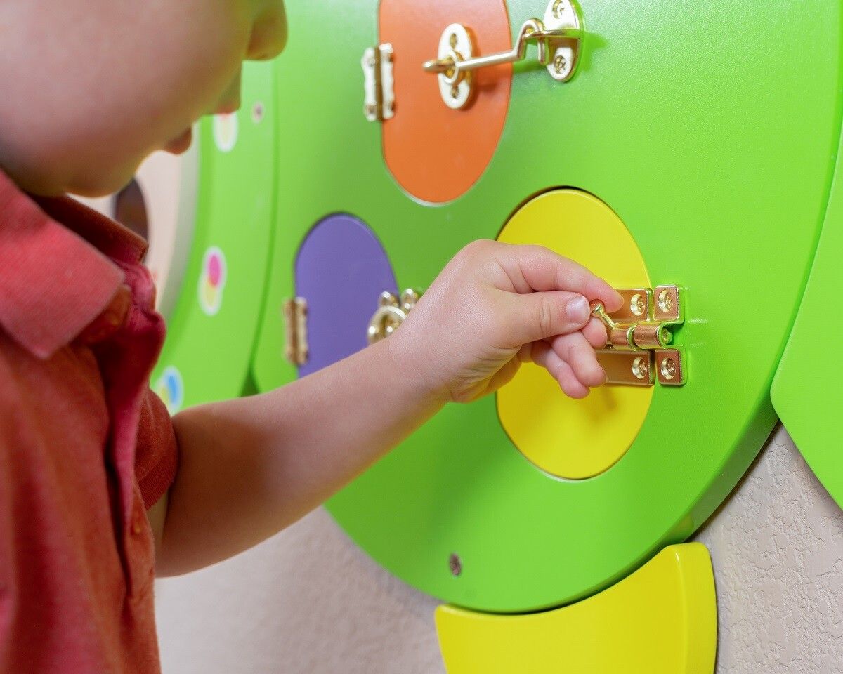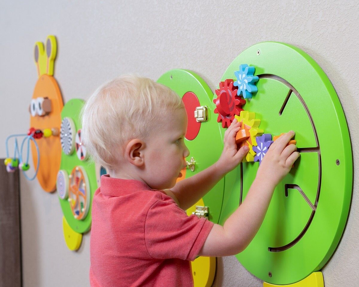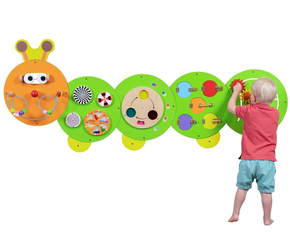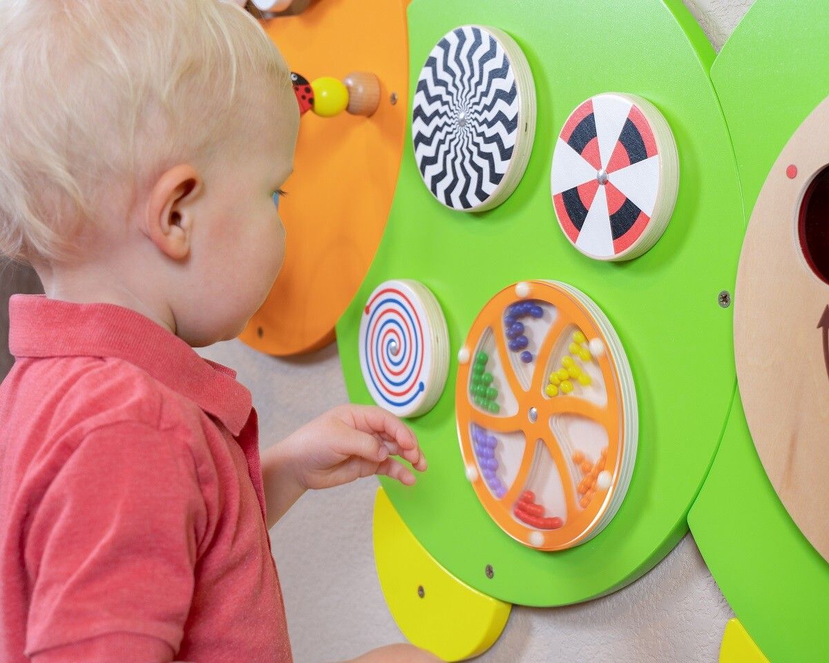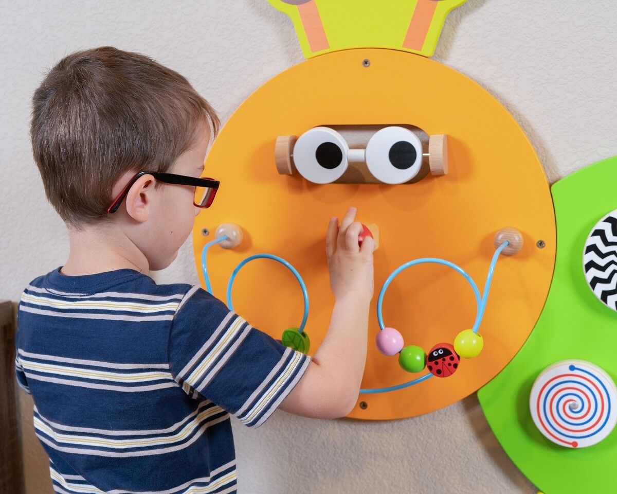 Namesti se na steno in ima 5 različnih delov, ki stimulirajo sluh, vid in dotik.