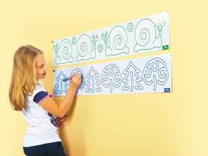 Komplet grafičnih okvirjev za podporo vaj za sproščanje rok; dopolnjen z magneti; Tri stopnje težavnosti (označene z barvo in razdaljami med črtami v okvirju). Vsak komplet vsebuje 4 plastične table za pisanje, ki se jih da brisati na suho. 98 x 17 cm