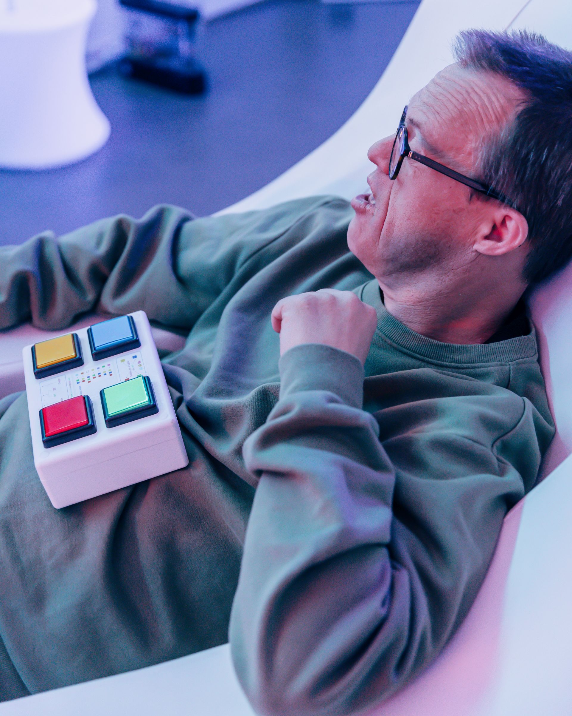 4 gumbi za kontrolo barve v stikalu za interaktivne odzive. Barve kontrolirajte s 4 gumbi. Če pritisnete več gumbov hkrati, lahko zmešate do 16 različnih barv. Za delovanje je potrebno dokupiti še artikel brezžični sprejemnik, s kodo 9SPSD.