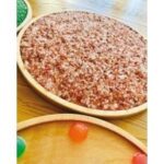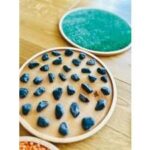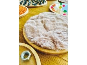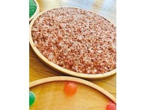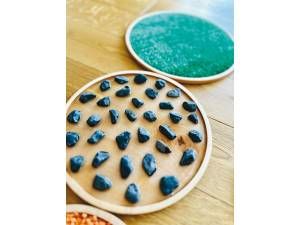 material: les, teksture: pomponi, kovinski oreški, mehka puhasta tkanina, leča, črni kamen, kavčukove kroglice, umetna trava, himalajska sol;
