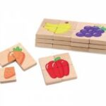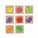 Specifikacija izdelka: 32 kosov; 8 štiridelnih sestavljank: banane, jagoda, jabolko, grozdje, paprika, jajčevec, korenje, brokoli; dimenzije: 4 x 1 x 4 cm; material: les, magnet: bombažna vrečka; starost: 18 mesecev +
