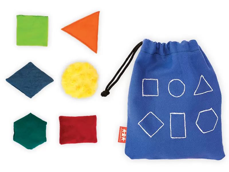 Barvite senzorične vrečke različnih oblik in tekstur, napolnjene s plastičnimi kroglicami. 6 vrečk v 6 barvah in oblikah. Dimenzije približno 15 cm; temno modra vrečka z vrvico 21 x 25,5 cm.