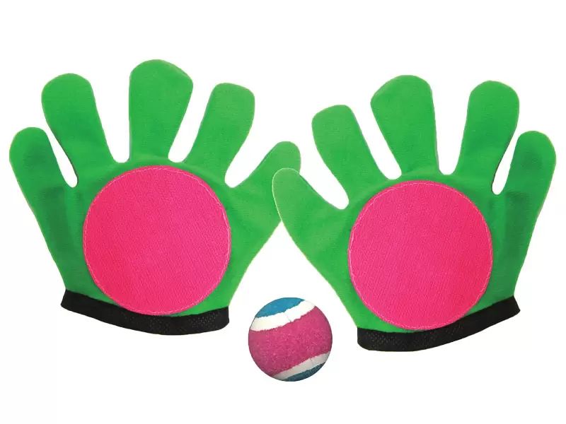 Trpežne rokavice iz lahkega materiala z ježkom za lovljenje žoge. 3 elementi: 2 rokavici, 1 žoga; dimenzije rokavice: 19,5 x 18,5 cm (univerzalna velikost); premer žoge 6,2 cm; materiali: blago, plastika; starost 5+