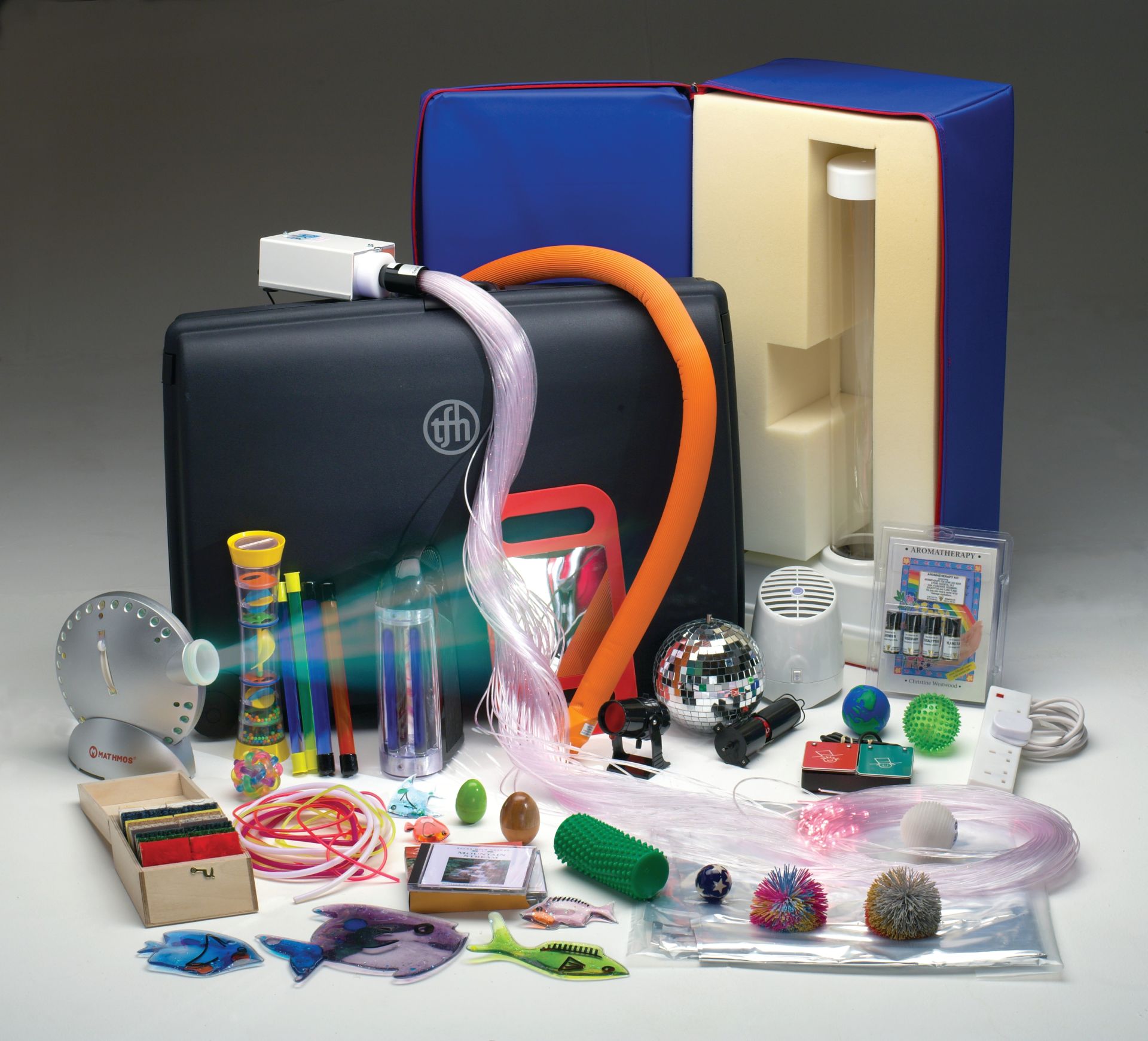 Delovni terapevti in drugi, ki delajo v terapijah, morajo imeti ta komplet. Kovček in Vodni stolp omogočita, da se Senzorna soba prinese k uporabniku in ne nasprotno. Čvrst kovček vsebuje veliko čutnih predmetov, od sproščanja do odzivnih učinkov, projektorja ter optičnih vlaken, aroma terapije, taktilnih vibracij in še veliko več.