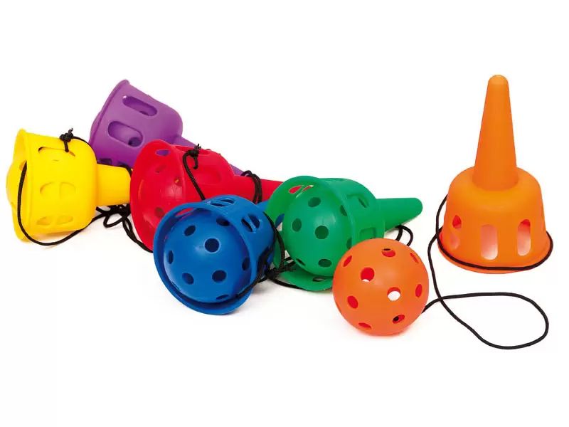 Udari žogico in jo poskusi ujeti v stožec, ki je z žogico povezan z vrvico. Igra razvija koordinacijo in reflekse. 6 kosov v 6 barvah, dolžina vrvice 85 cm, premer kroglice 7 cm, višina stožca 16 cm.