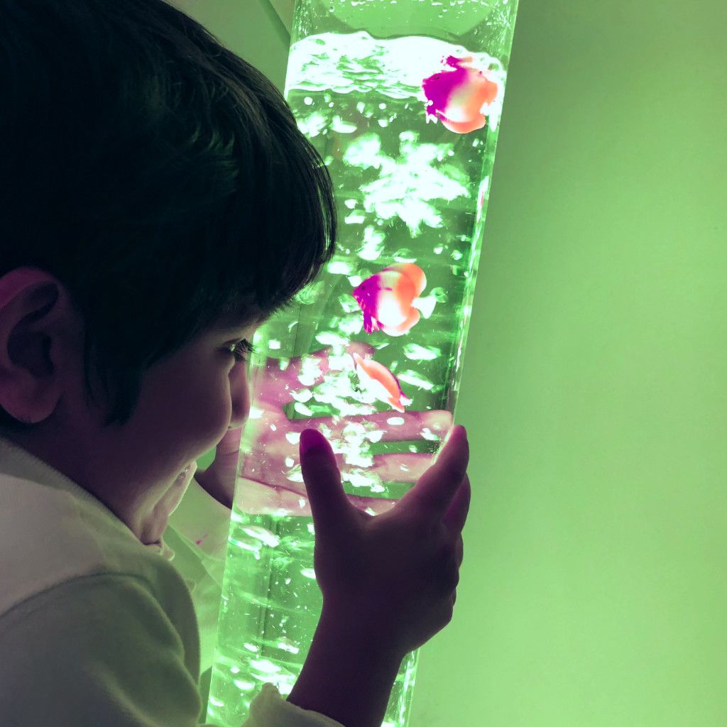 Vodni stolp z mehurčki, možnost reguliranja mehurčkov s stikalom (stikalo ni vključeno). Barve so najbolj vidne v temnem prostoru. Nekoliko tanjši vodni stolp.